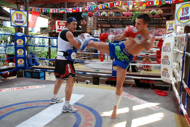 | Fabio Pinca, french WBC world champion in the muay thai training camp 13 Coins owns by Somchai Nitiwatanakul (left) before the 1/2 finals and final of the Thai Fight tournament. |